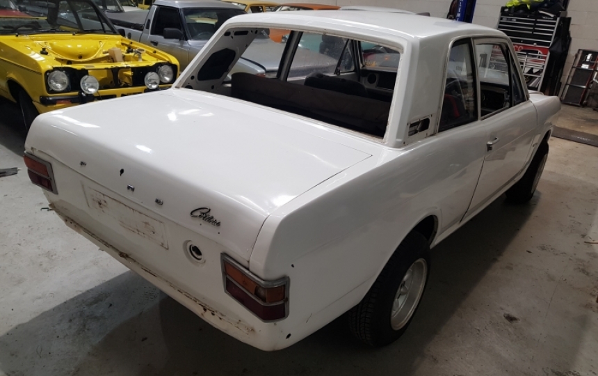 Body - 2 door MK2 Cortina export spec shell with extra strut top strengthening plates similar to 1600E and Lotus. Original and solid inner wings, arches, doors, bootlid, bonnet, wheel tubs, etc. Paintwork a bit scruffy due to age. Will need a couple of very minor repairs underneath on 1 outrigger and one rear wheel well. Overall though extremely solid and original for its age.