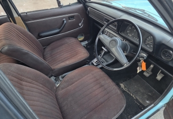 Interior - Brown cloth seats which are perfectly useable. Front seats are good. Rear have some sun damage on top. Front door cards have speaker holes. Carpet is worn through. Headlining is good, dashtop has a crack.