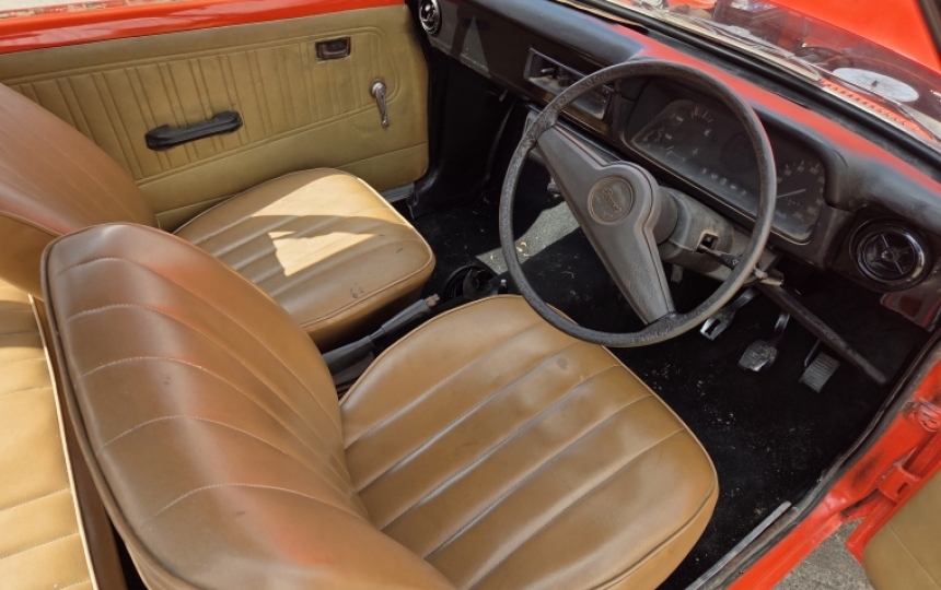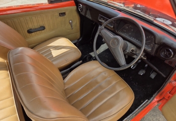 Interior - All standard and fairly well worn. Beige vinyl seats which have no rips but will take your skin offf on a hot day. Original headcloth which needs a clean but is useable. Dash top has been recovered poorly. Standard clocks and steering wheel.