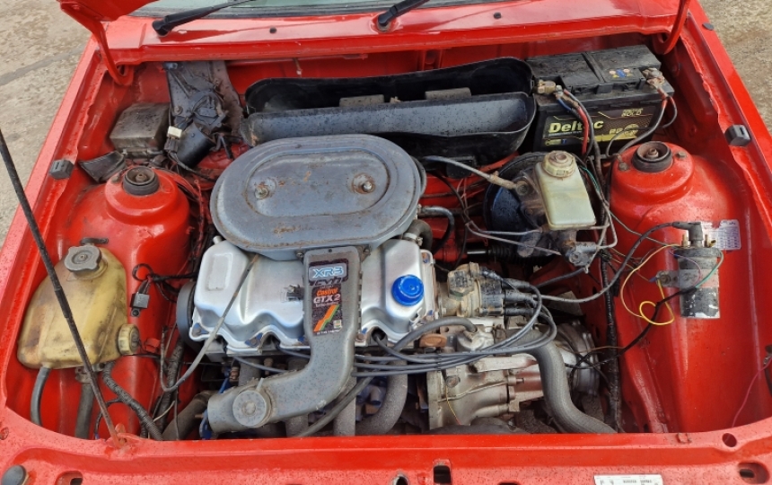 Body - Early XR3 shell with two bolt type strut tops. Good solid floors. Original inner wings, arches, sills etc. Paintwork is OK but lot of overspray in the underbonnet area. Hella style grille, African spec XR3 Decals. Will need repairs on both inner rear quarters at the back.